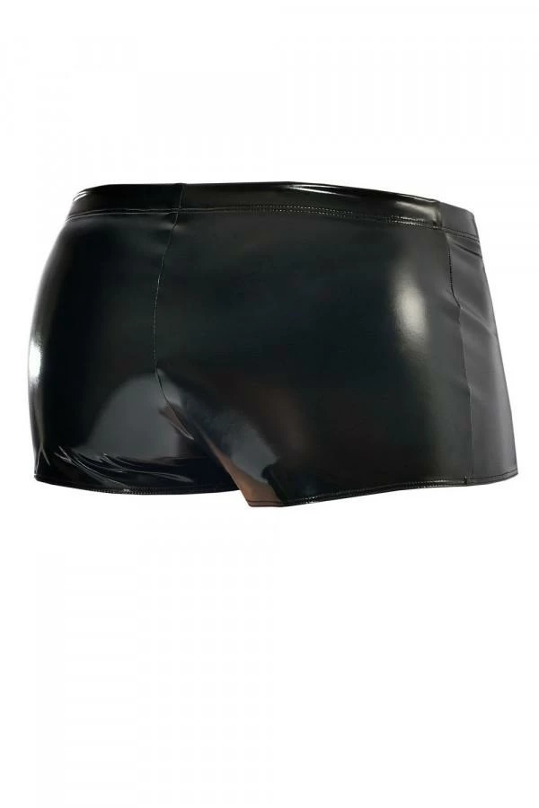 These are a low waist men`s fetish vinyl trunks. They have a small pocket with a zip on the front. Available Sizes: Small to XX-Large