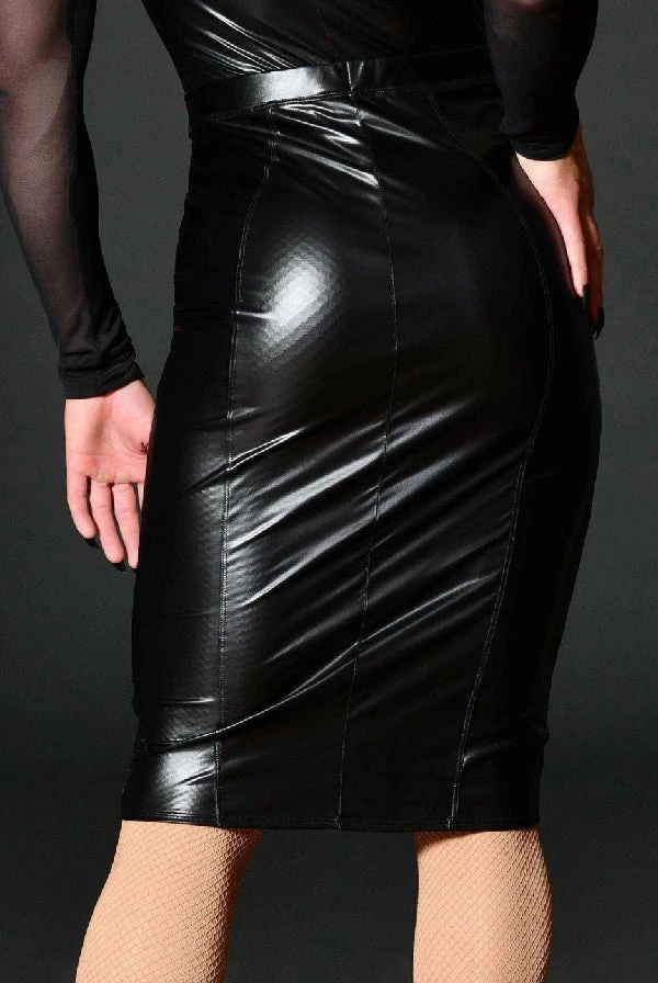 A pretty high waist pencil skirt in shiny wet-look. Length below the knee. Its long, separable zipper on the front, will allow you to open the bottom of the skirt and create a slit. Wear it with the Gabrielle bodysuit as in the photos.