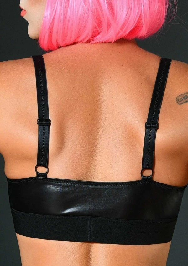 Mme Monique bra is crafted in shiny wet-look and embellished with delicate velvet embroidery. Wide elastic under the bust and adjustable straps. Wear it with the thong of the same name and the Mme Emilie garter belt.