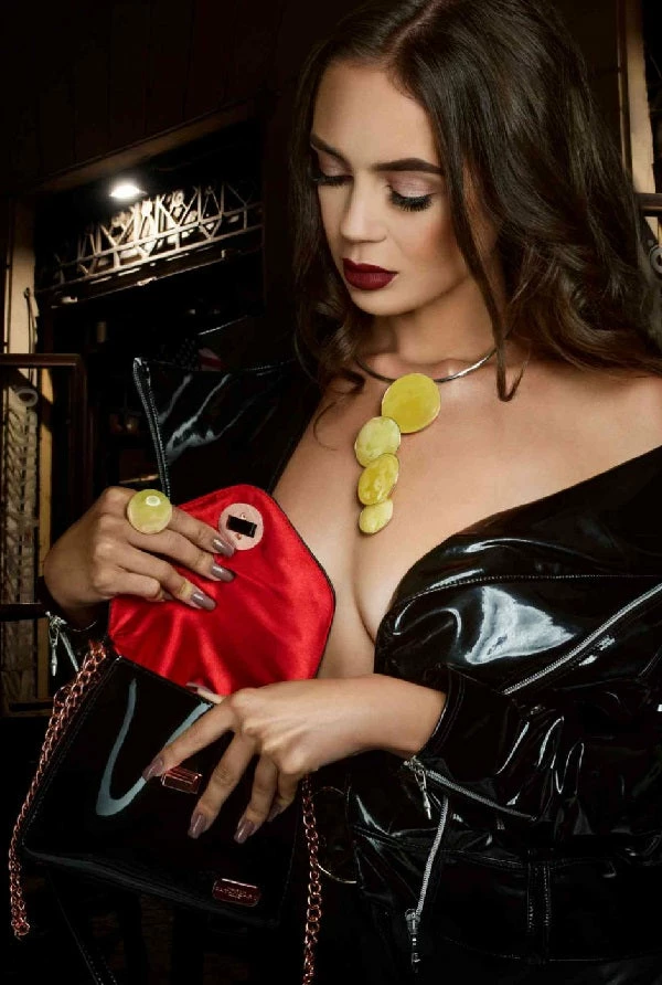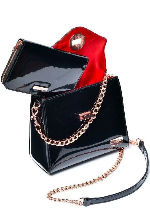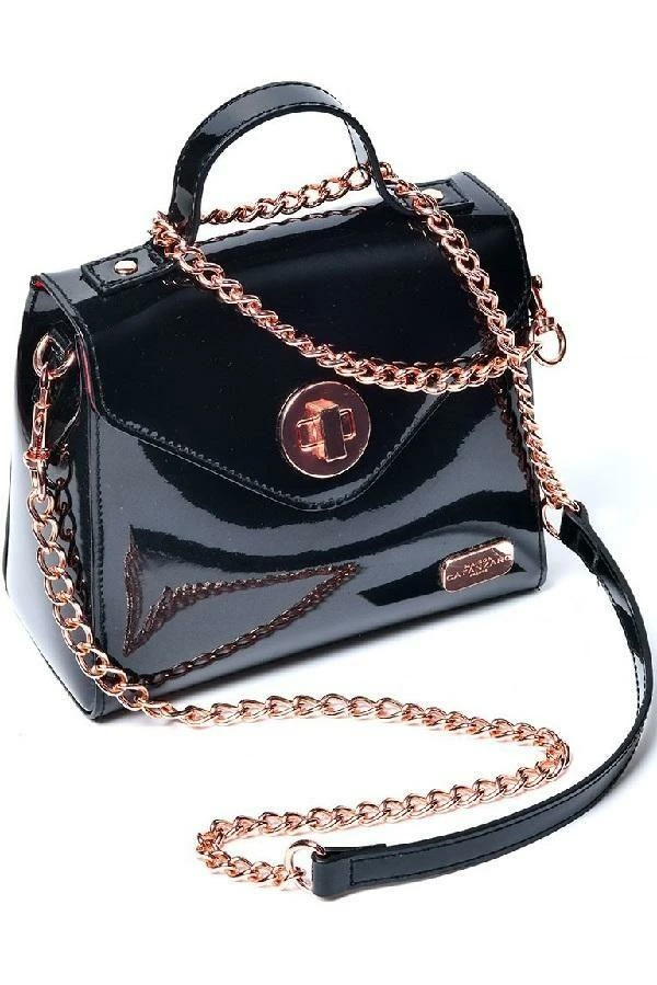 The outside of the bag is made of black vinyl, one of Patrice’s favourite materials, and it has a very elegant red satin interior. The removable handle is in rose gold colour, like the jewelry of the Charlotte lingerie. A nameplate in pink gold, with the Maison Catanzaro logo, decorates the front of the bag.