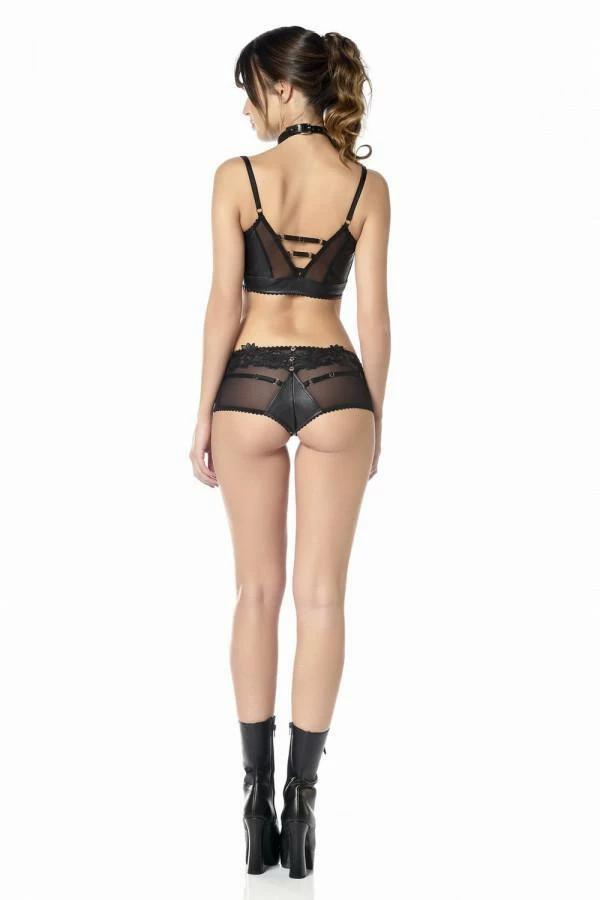 This is a sensual bralette made of high quality faux leather. The cups are decorated with floral embroideries which highlight the chest. An adjustable strap at the back and a hook and eye closure on the left side will ensure a perfect fit. This very feminine piece has a nice strappy back made of faux leather and mesh.