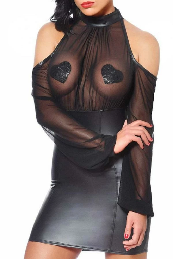 Perfect for your fetish parties! This dress is made with two different fabrics: a transparent mesh top that shows off your breasts and a slinky wet-look bottom. The nice puff sleeves have wet-look cuffs. Wear it with Sophie waist cincher also available to purchase on site.