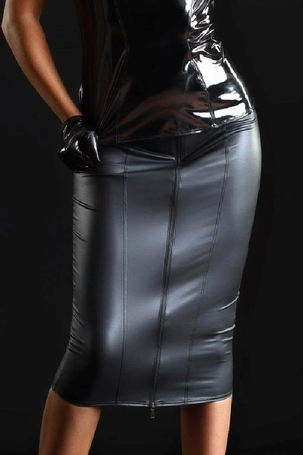 Black midi skirt can be worn day and night. Made of black wet-look leather, it is the indispensable piece in your wardrobe. It closes with a zipper on the front.