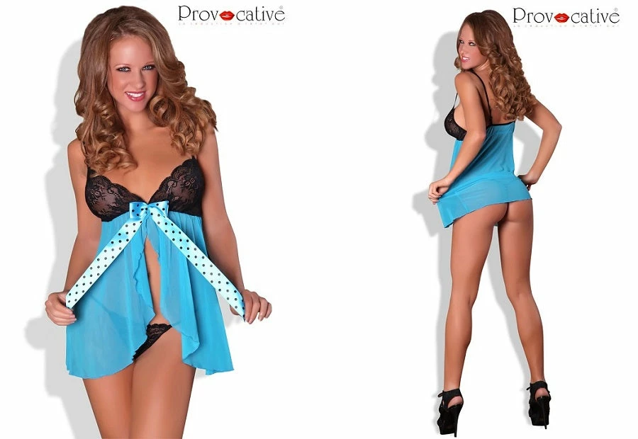 Super cute open front blue baby doll nightdress with black lace cups and tied with a dainty spot ribbon at front