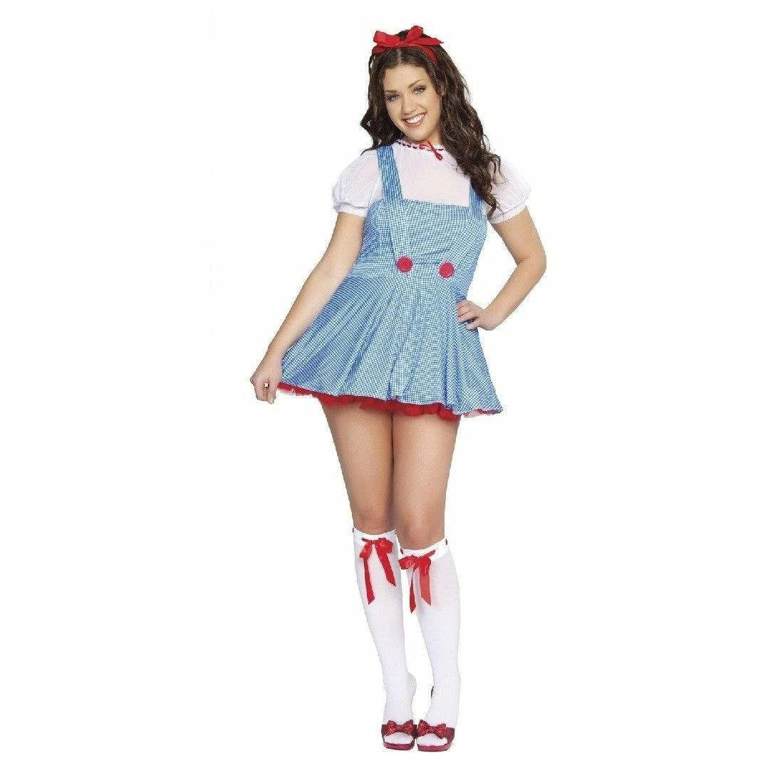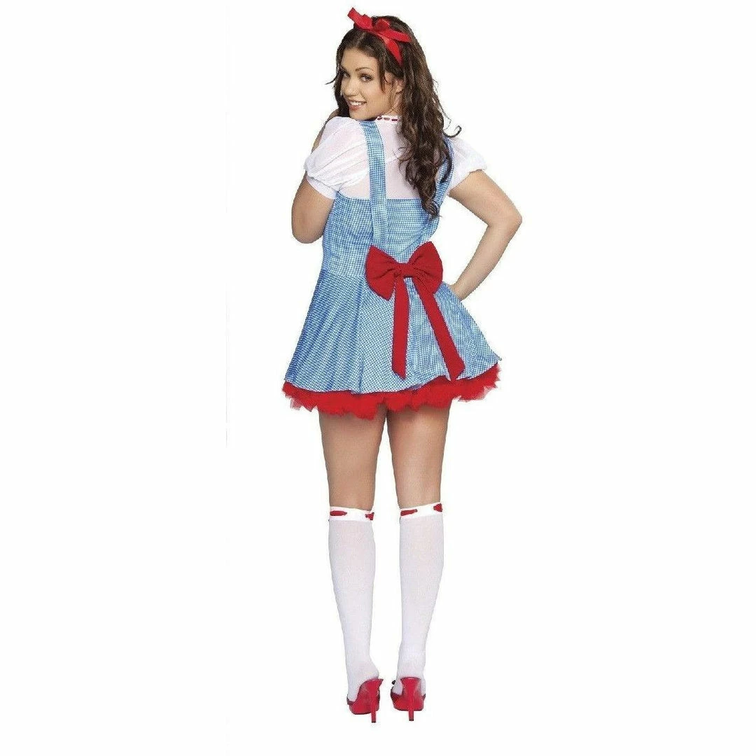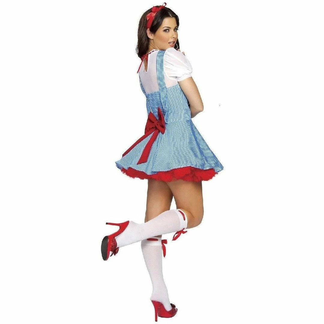 Sweet Dorothy Wizard of Oz themed fancy dress costume. This costume includes a dress with button and bow details.
