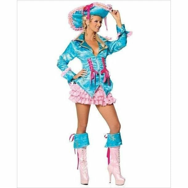 Gorgeous Caribbean captain sexy costume set including jacket, skirt and hat. Comes in adorable turquoise colour with pink. Stunning jacket has floral embroidery print, collar, lace trimming on cuffs and collar, front zipper closure and ribbon lace-up details.
