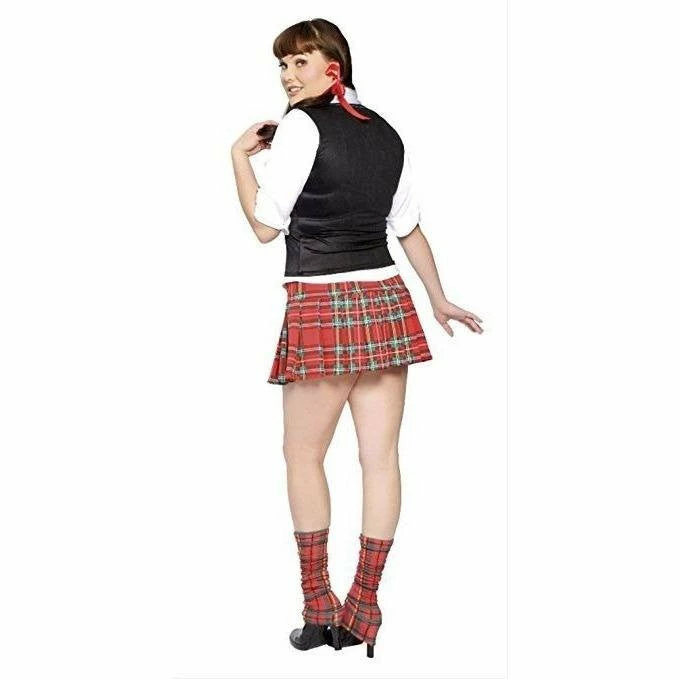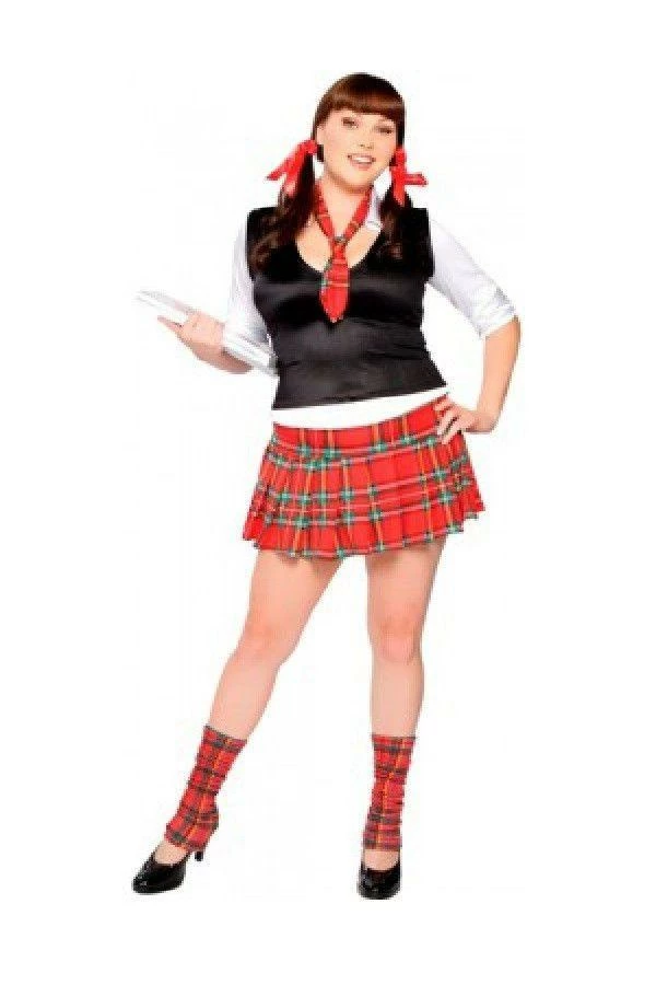 School girl inspired fancy dress costume, two piece spartan princess costume. This three-piece school girl costume includes top, pleated skirt and neck tie.