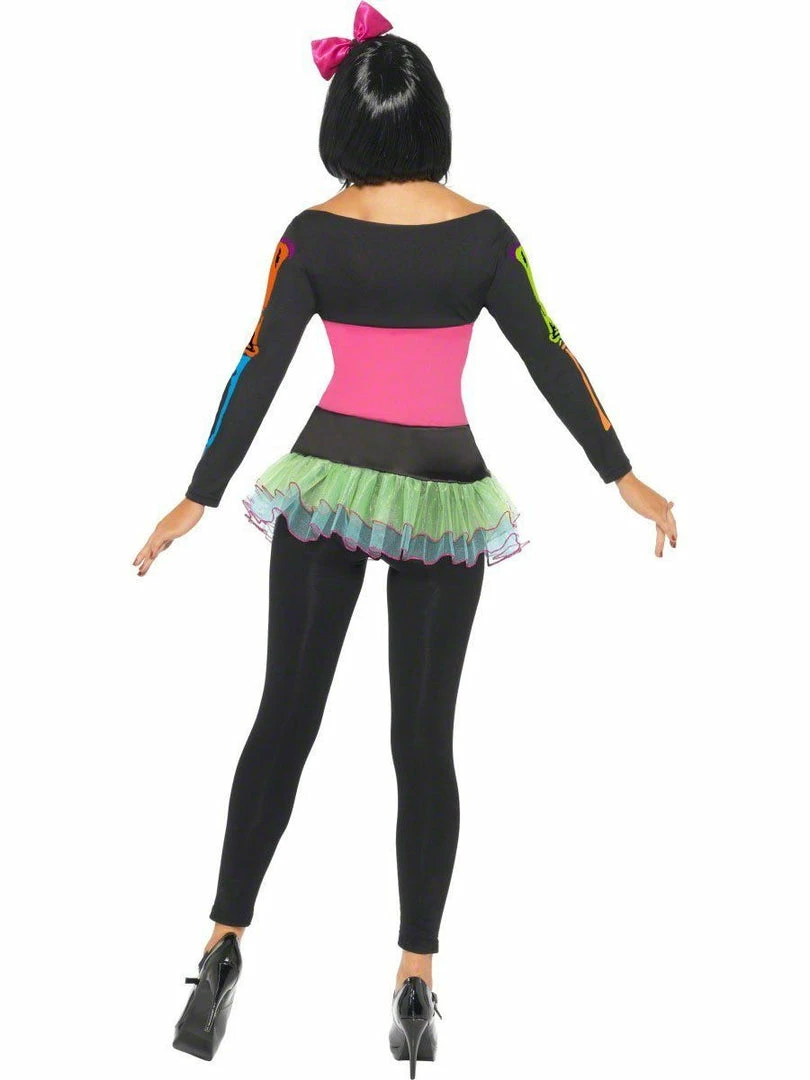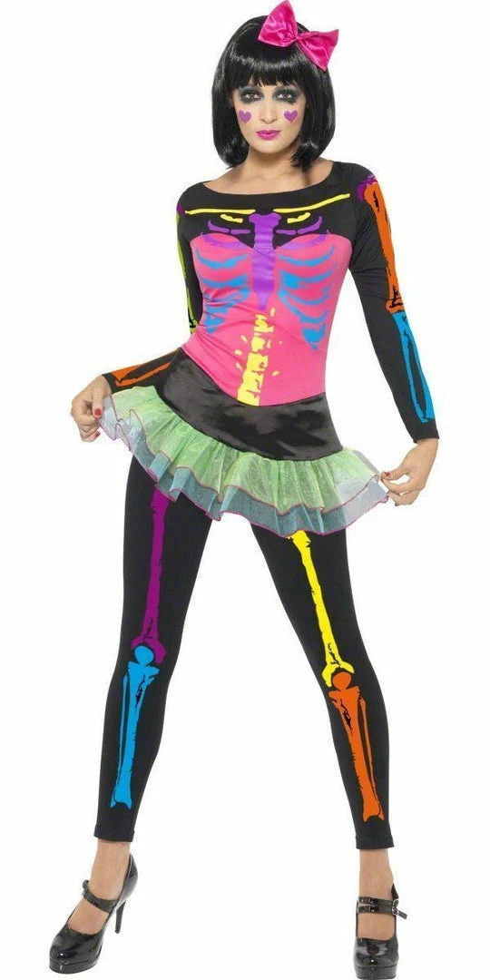 IN STOCK Adult Neon Skeleton Costume comes complete with Long sleeved Top with Attached Skirt and Footless Tights with brightly coloured bones. Outfit includes: