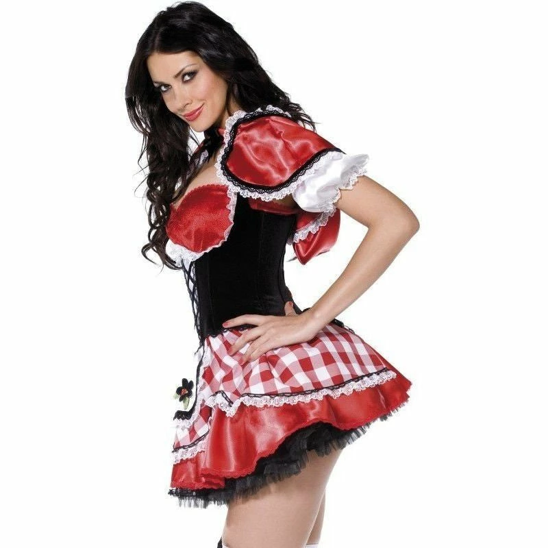 Fever Boutique Red Riding Hood Costume includes cute chequered red and white dress with white puffed sleeves it also has black and red corset top, white satin apron with black and white lace frill, red cape with bow tie.